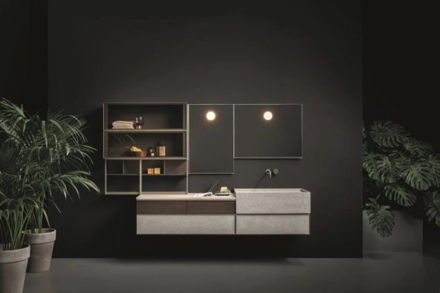 Elva se décline en meuble à poser avec trois grands tiroirs ou en version suspendue avec simple ou double vasque, de 60 à 190 cm. Adapté à toutes les salles de bains.