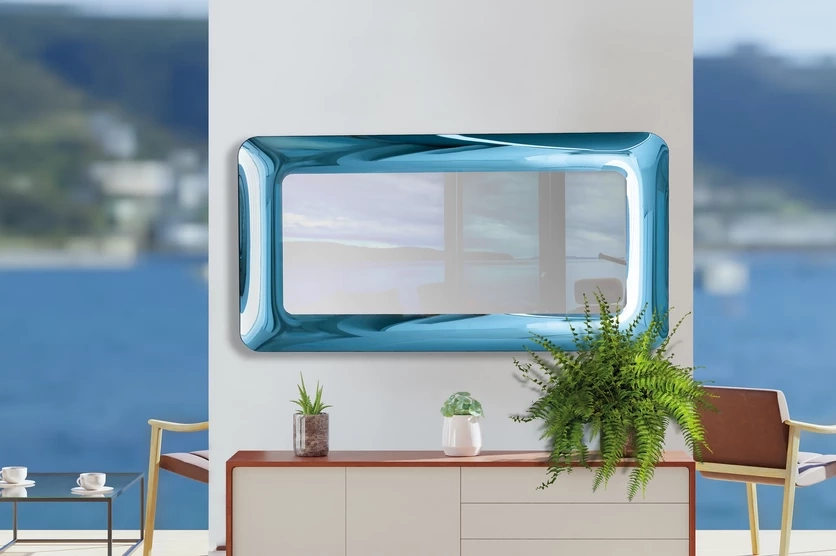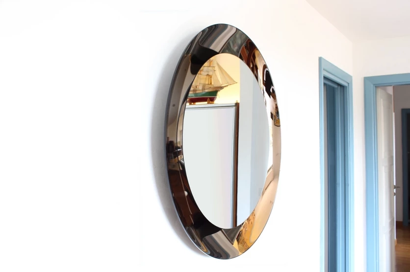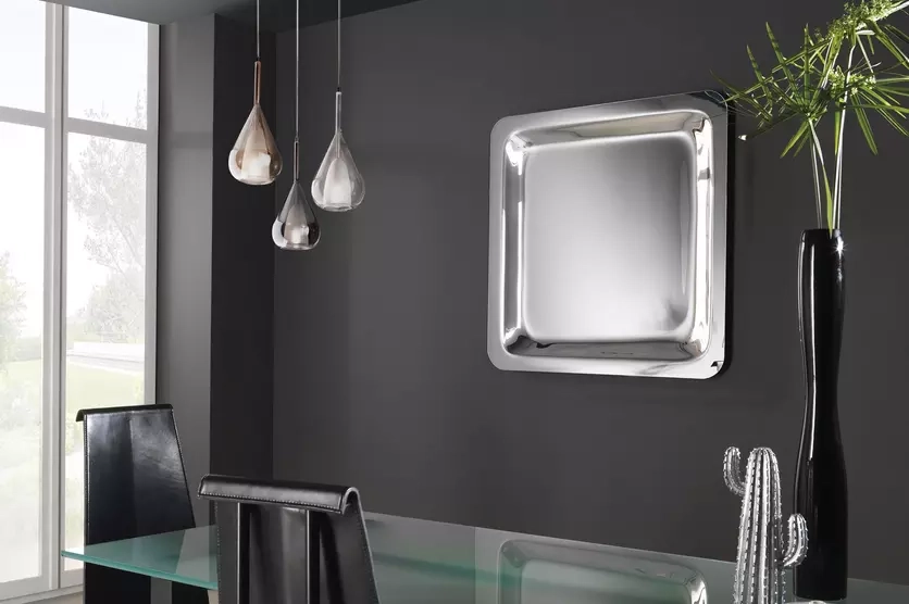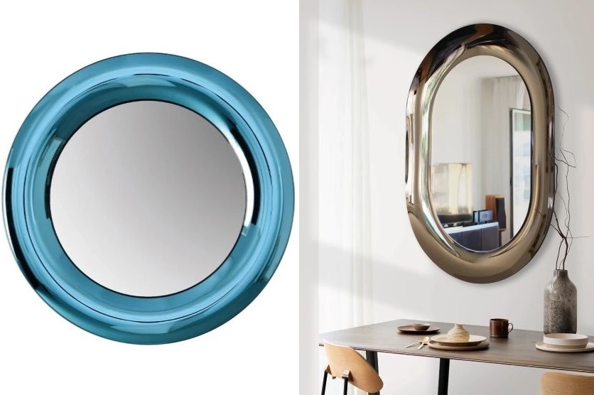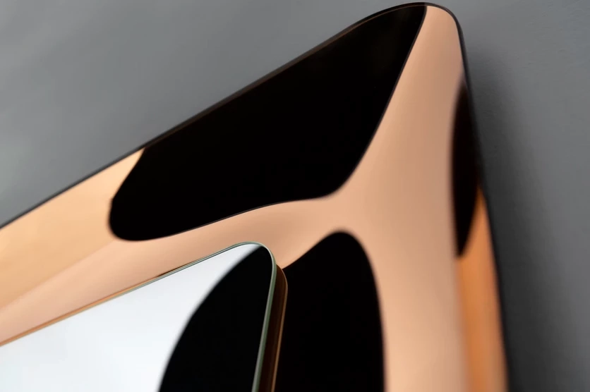 Le verre est courbé en premier lieu dans des fours de déformation, assurant une courbure uniforme sur tout son pourtour, créant ainsi une continuité esthétique. Après cette étape, la surface est argentée, offrant un miroir traditionnel, mais avec une bordure courbée qui accentue sa singularité. La série se décline en plusieurs formats : rond, ovale, carré et rectangle et dans differentes tailles :