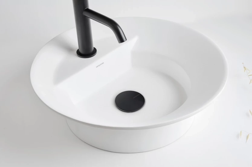 Vasque à poser ronde Sira gel coat blanc mat. Disponible dans tous coloris RAL.